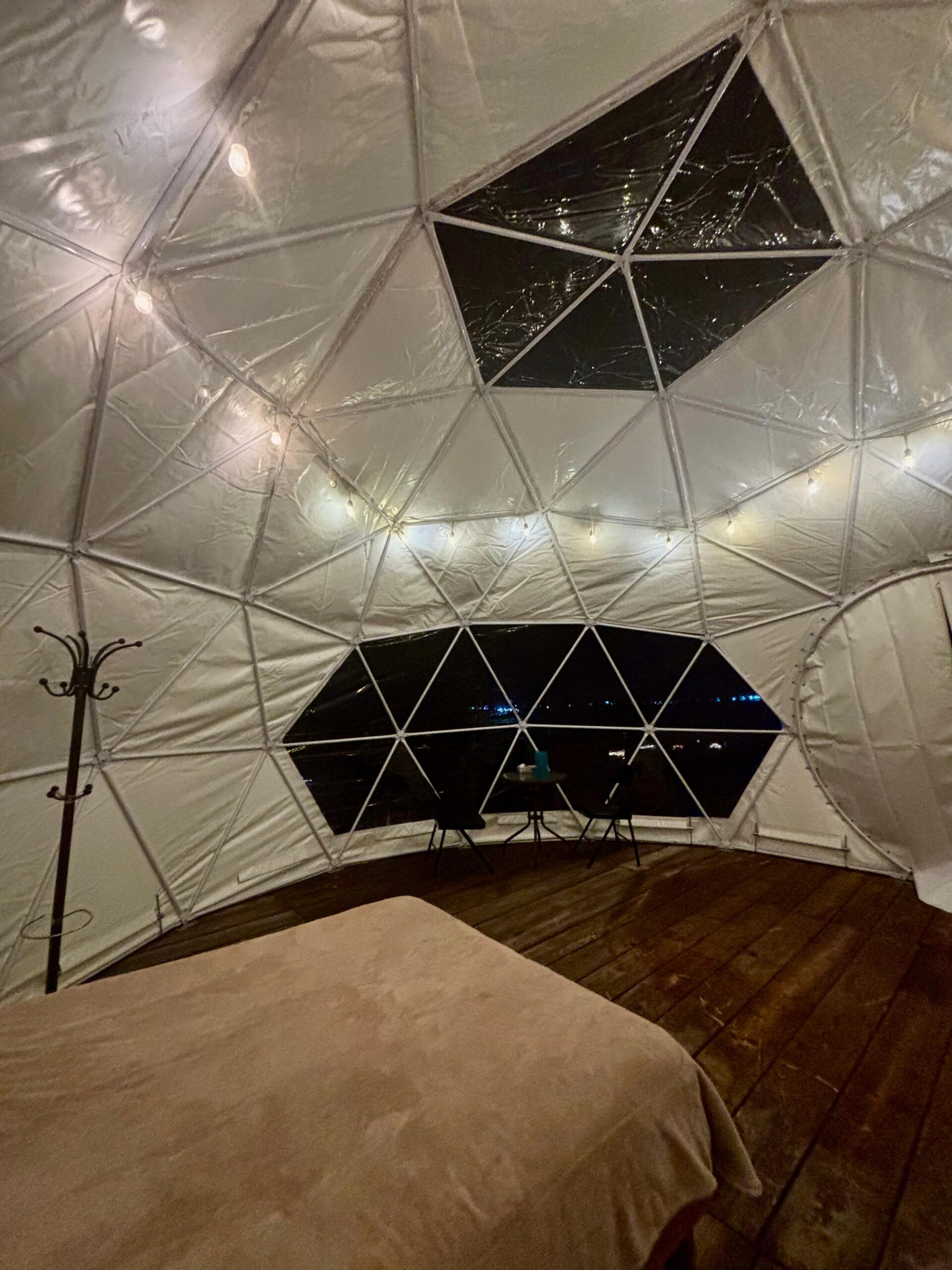 En lugar de dormir en una casa de campaña tradicional tu estancia es un domo geodesico equipado con las comodidades necesarias para un descanso completo